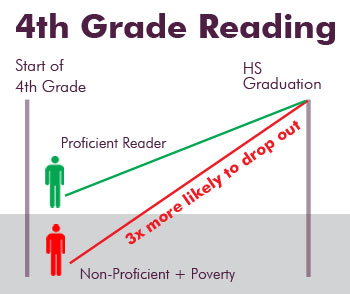 The research tells us that one in six children who are not reading proficiently in 3rd grade do not graduate from high school on time, a rate four times greater than that for proficient readers. Poverty only compounds the problem. Children who are not reading proficiently at 3rd grade and who have lived in poverty are three times more likely to drop out or fail to graduate than those who have never been poor. (Double Jeopardy, Annie E. Casey Foundation 2012)