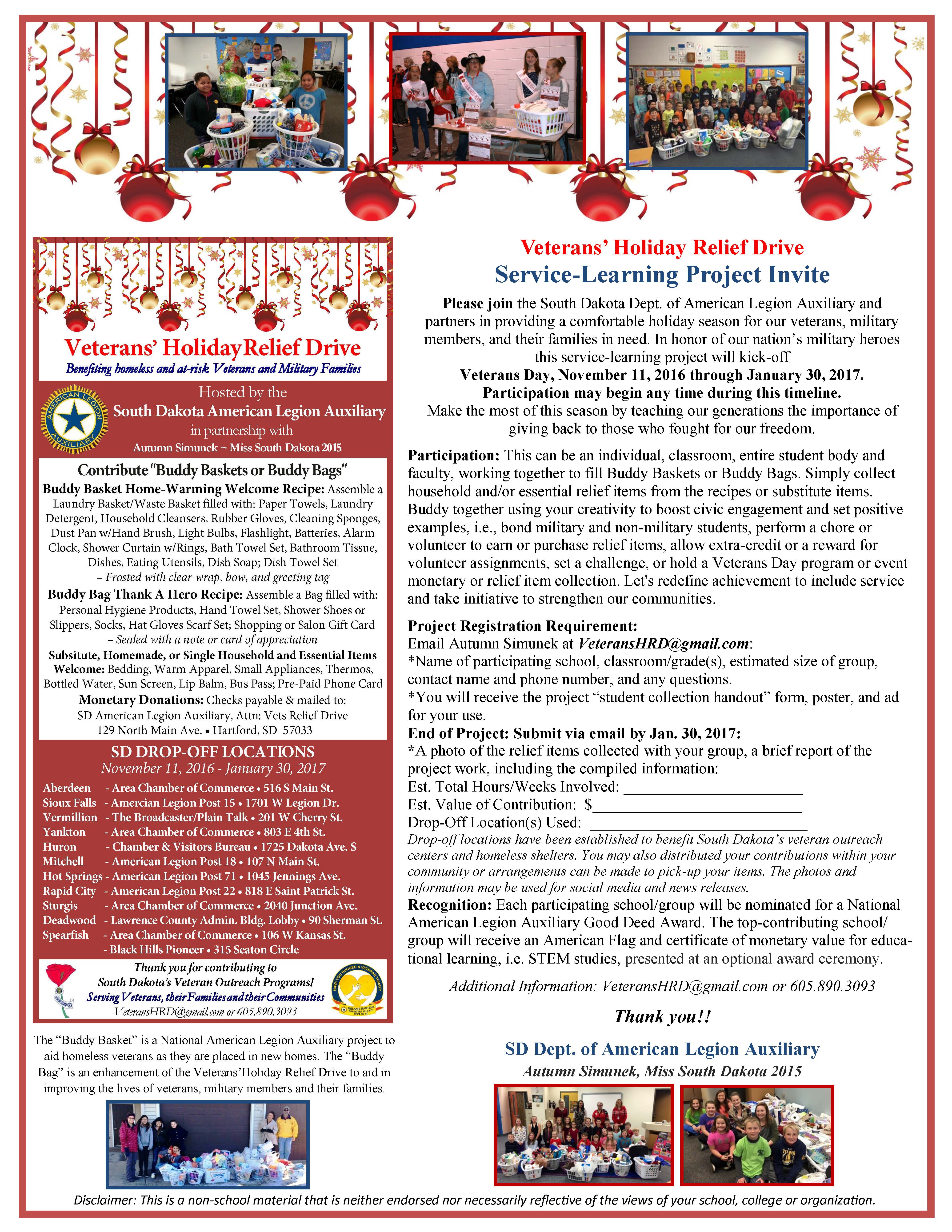 Schools are invited to participate in the Veterans’ Holiday Relief Drive Service Project by filling Buddy Baskets. Each participating school/group will be nominated for a National American Legion Auxiliary Good Deed Award. Find more information on this poster. |