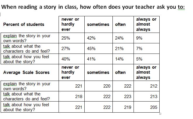 NAEP gathers data about schools, teaching practices, and student perceptions as part of the overall assessment. Below are percentages and scale scores for fourth graders regarding what they are doing in reading.